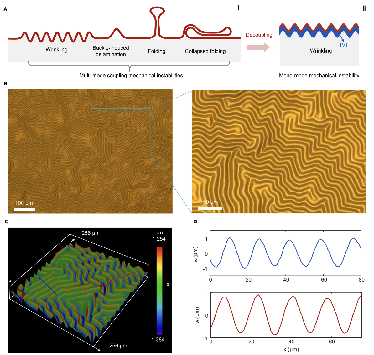 研究团队针对极端尺度薄膜器件结构多模态表面失稳的力学调控难题,通过在二维薄膜和柔性基底之间巧妙地引入一层多功能光敏中间层 (Intermediate- multifunctional layer, IML),并结合了一种新型的二维薄膜结构低温后固化转移工艺,构建了一种石墨烯/IML/PDMS三层结构新体系,提出了基于界面应力工程的表面失稳多模态解耦调控方法,有效地调控了层间界面黏合强度和界面应力,突破了二维纳米薄膜结构多模态耦合表面失稳的解耦难题,首次实验实现了单原子层等极端尺度器件结构确定性动力失稳模态和确定性力学自组装 (图1)。
