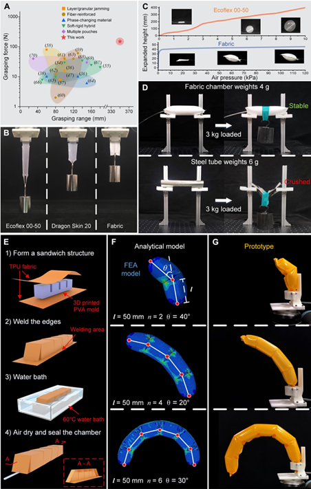 该设计发挥织物材料柔软而抗拉伸的独特性能,通过TPU热粘合工艺,构建封闭织物气腔在正压气源作用下,兼具气动软体驱动的柔顺性以及如同气压千斤顶般的高承载能力,所制备标准柱形腔体在压强作用下,具有优于相似质量钢管的结构刚度;为进一步使其具备更加丰富的驱动特性,研究团队创新性地提出一种基于水溶性内模具的气道构建方法,使得所制备柔性机器人的运动可编程且可提前进行精确的建模分析。