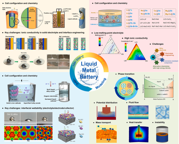 在众多类型的储能技术中,电化学储能具有能量密度高、响应快、建设周期短、安装灵活等优势。对于固定式、规模化的储能应用,评价电池性能的关键指标有经济性、安全性、能量密度、功率密度、能量效率等。针对这些指标,国内外学者重点关注采用储量丰富的材料作为电池活性材料,发展本征安全电池体系,探索新的电池化学(正负极材料和电解质)等,以替代目前占主导地位但面临成本高、资源不足、安全事故频发等突出问题的锂离子电池。由于可充电液态金属电池具有长寿命、低成本、大容量及高安全性等优势,而广义上的液态金属电池为至少包含一种液态金属电极的电化学储能器件,金属电极的液态化使这类电池摆脱了传统固态电极材料因结构稳定性差、易产生枝晶而导致的循环寿命短、热失控等问题,并且液态电极独特的传质与反应动力学特性使这类电池具有大容量、高功率等优点。现阶段,部分高温液态金属电池已初步实现商业化,而新兴的中低温/室温液态金属电池尚处于研究初始阶段,仍面临着循环稳定性、经济性等多方面挑战。