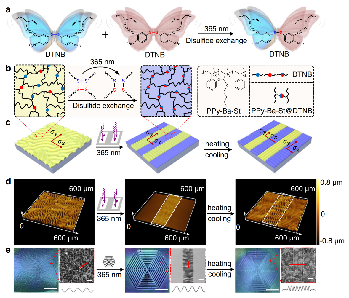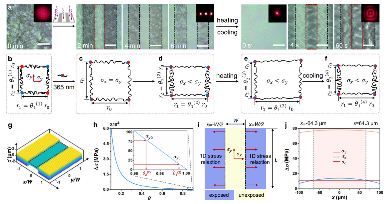 研究团队将含吡啶的共聚物和含光敏二硫化物的苯甲酸单体组成的动态交联超分子聚合物网络,旋涂在聚二甲基硅氧烷(PDMS)弹性体上,构筑光响应动态超分子硬膜-软基体系。上述体系在365nm紫外线照射下,由二硫键交换引起的交联超分子网络的内部应力松弛,可以选择性地消除硬膜-软基体系中曝光区域表面失稳结构。更值得注意的是,最初垂直于曝光边界的未曝光表面失稳结构在加热/冷却后出现正交的结构拓扑突变现象。研究团队将光诱导的二硫键动态交换的微扰效应引起的硬膜-软基体系中表面失稳结构拓扑结构突变现象,称为光控动态超分子诱致硬膜-软基体系的“蝴蝶效应”。为了厘清上述跨尺度“蝴蝶效应”形成的力学机理,研究团队建立一种聚合物薄膜表面失稳-动态超分子链之间的跨尺度非线性本构力学模型,揭示了光驱动体系表面失稳-薄膜应力松弛-分子二硫键动态交换的跨尺度耦合作用机制,为基于表面失稳结构的超分子尺度扰动行为可视化探测提供坚实的理论支撑。