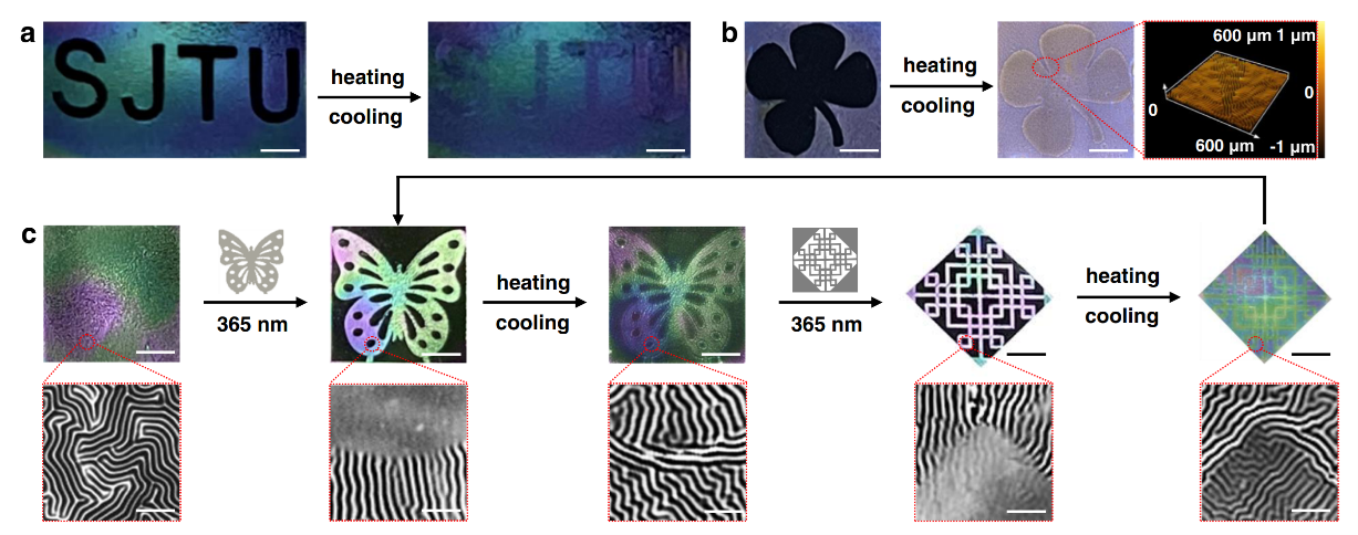 研究团队进一步利用基于光诱导硬膜二硫键交换的扰动效应,可以实现对薄膜应力分子层面可控编辑,并通过选择性紫外曝光制备一系列复杂表面失稳结构图案,如“SJTU”字母、三叶草、中国结和蝴蝶等形状图案被光刻在功能表面器件上,随后被选择性地擦除,且不同形状的复杂图案信息可以多次迭代地在双层膜的表面上可重构写入-擦除,并且由于写入和擦除区域之间的光散射强度不同而使其肉眼可见。因此,上述可重构表面失稳图案可用于智能信息显示、动态无墨印刷和防伪等领域。