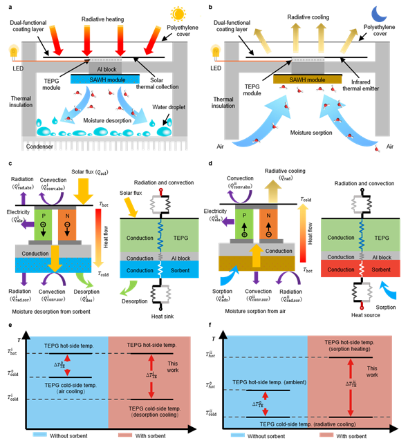 近日,制冷与低温工程研究所ITEWA团队在国际期刊Nature Communications发表了题为“Simultaneous Atmospheric Water Production and 24-hour Power Generation Enabled by Moisture-induced Energy Harvesting”的研究论文。该论文通过协同利用水蒸气的吸附热/解吸热、白天的太阳能光热转换、夜间的辐射致冷,提出了一种基于水蒸气吸附诱导的能量收集策略,实现了全天候的高效空气取水和24小时持续温差发电。制冷与低温工程研究所吴闽强博士生、许嘉兴博士后、李廷贤研究员为论文的共同第一作者,通讯作者为李廷贤研究员,王如竹教授对该工作做出了重要指导和建议。