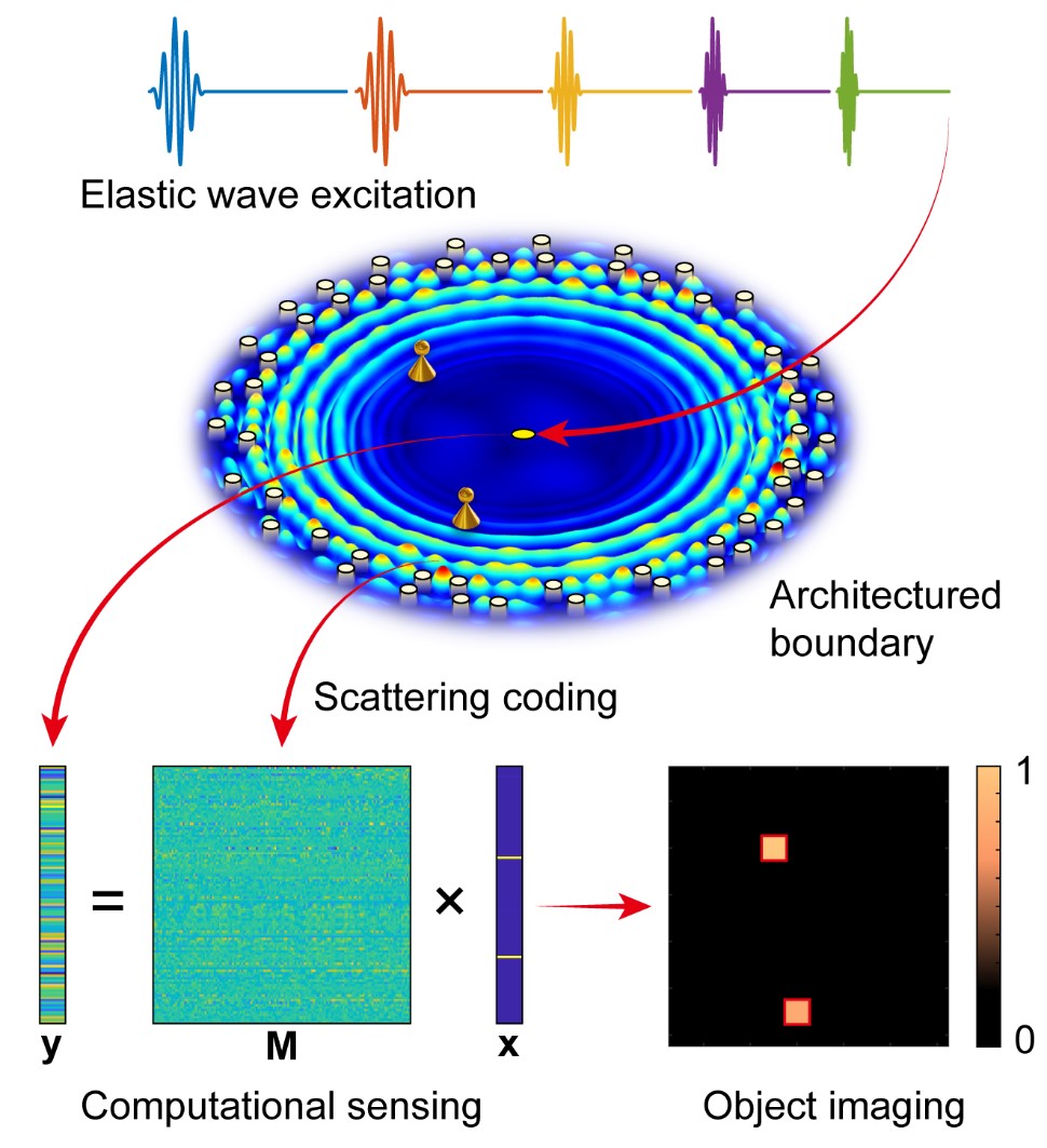 论文提出了对空间弹性波散射场编码的结构化边界概念。结构化边界由空间随机分布的散射体构成。单个换能器激励具有多个中心频率的脉冲信号,并接收目标反射的回波信号;每一次脉冲的发射与接收被视为对目标的一次观测;利用结构化边界对弹性波的多重散射效应,将复杂扰动引入空间散射场,可以产生高度不相关的空间散射编码,从而消除目标位置信息的歧义性,仅用单个换能器实现对弹性波的计算感知。