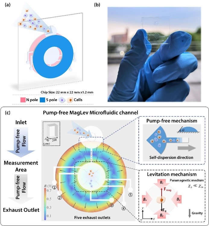 近日,上海交大beat365中文官方网站振动、冲击、噪声研究所张文明教授团队联合生物医学工程学院康亚妮副教授团队开展交叉学科研究,在生物传感领域期刊BIOSENSORS & BIOELECTRONICS上发表了题为Pump-Free Microfluidic Magnetic Levitation Approach For Density-based Cell Characterization的研究论文,提出了自驱动式非标记抗磁悬浮密度表征方法,设计了多通路式微流体芯片,建立了微尺度悬浮物检测力学模型,研究了微流体自驱动机制的加工工艺,实现了不同谱系及药物作用下细胞密度的有效表征。论文第一作者是博士后高秋华,张文明教授为共同通讯作者。