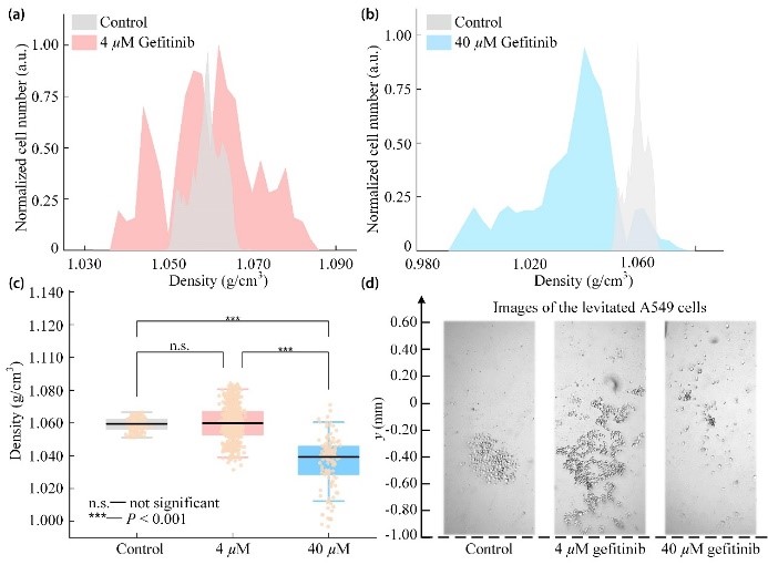 为了验证方法有效性,论文分别对来自不同谱系的细胞进行密度表征。结果表明,相比于正常细胞,癌细胞在细胞密度与尺寸方面具有显著的细胞异质性。此外,该方法也可实现不同浓度药物(吉非替尼)作用下肺癌细胞(A549)的密度检测,为癌细胞异质性表征及药物作用效果评估提供了潜在的技术支撑。