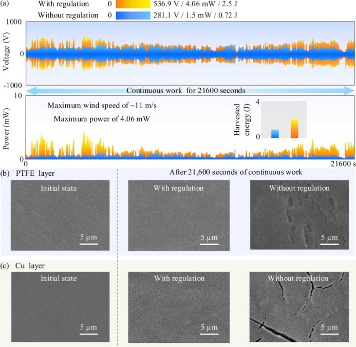 本文提出一种具有自调控策略的摩擦纳米发电机(TENG-SS),实现了自供能风速传感。通过合理设计离心力和非线性磁力,摩擦纳米发电机功能材料的分离和接触程度可针对不同风速自动调节。风速较低时,气动力小,在自调节下摩擦阻力也小,装置容易启动,磨损小;在高风速下,空气动力可以克服更大的摩擦阻力,产生更多的电能。基于TENG-SS的工作原理,本文建立了动力学模型,并进行了实验验证,分析了关键参数对TENG-SS性能的影响。此外,在21600秒的自然风环境中,本文对有和无自调控策略的样机进行了比较,证明了所提出的TENG-SS具有更好的电学性能和鲁棒性。这种自我调节机制具有较高的电学输出性能,减少摩擦阻力和材料磨损,并显著提高设备性能和使用寿命。同时,TENG-SS可以用于自供能风速测量和无线信息传输。本研究提供了新的设计视角,即通过力学调控的方法,提高能量采集系统在复杂环境中的综合性能。