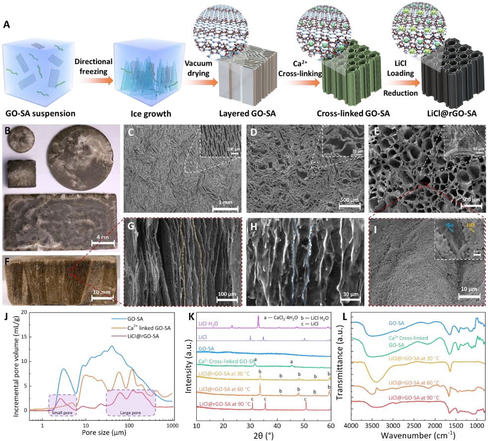 图1 垂直阵列石墨烯水凝胶基复合吸附剂(LiCl@rGO-SA)的合成与结构表征