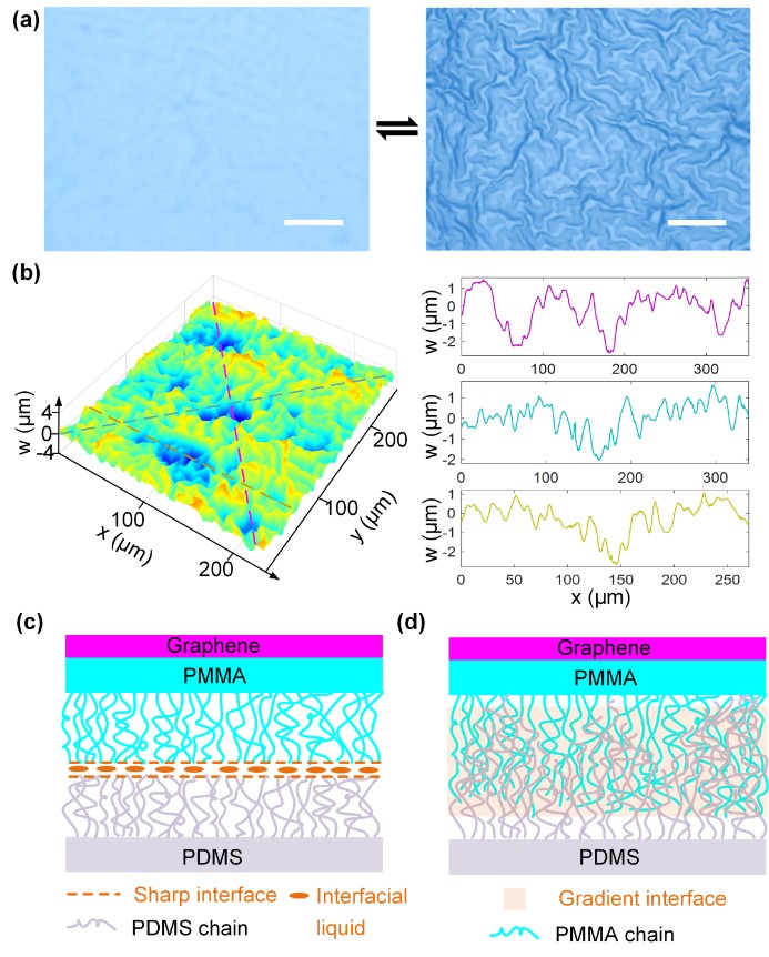 (a)可逆的多尺度石墨烯共形褶皱功能表面; (b) 三维形貌表征;(c-d) 多层系统中梯度界面层的化学成因