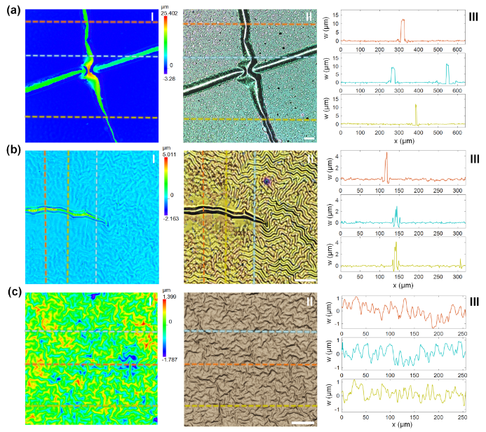 不同制造工艺下褶皱表面图案对比研究:(a) 传统湿法转移;(b)传统湿法转移工艺,低温多步平坦化工艺;(c) 后固化工艺。