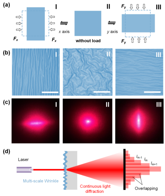 研究还观测到多尺度共形石墨烯褶皱具有新奇的连续衍射现象,与传统单一尺度褶皱结构的离散衍射现象存在着显著的差异。通过引入光栅衍射理论揭示上述现象的物理机制,研究表明:共形褶皱的多尺度性引起了多角度、多级衍射光的叠加效应。上述石墨烯表面具有优异的光学衍射性能与表面浸润性,在光编码加密技术、光操纵、光学双稳态器件和可调超疏水智能表面器件等应用方面有着巨大的应用价值。