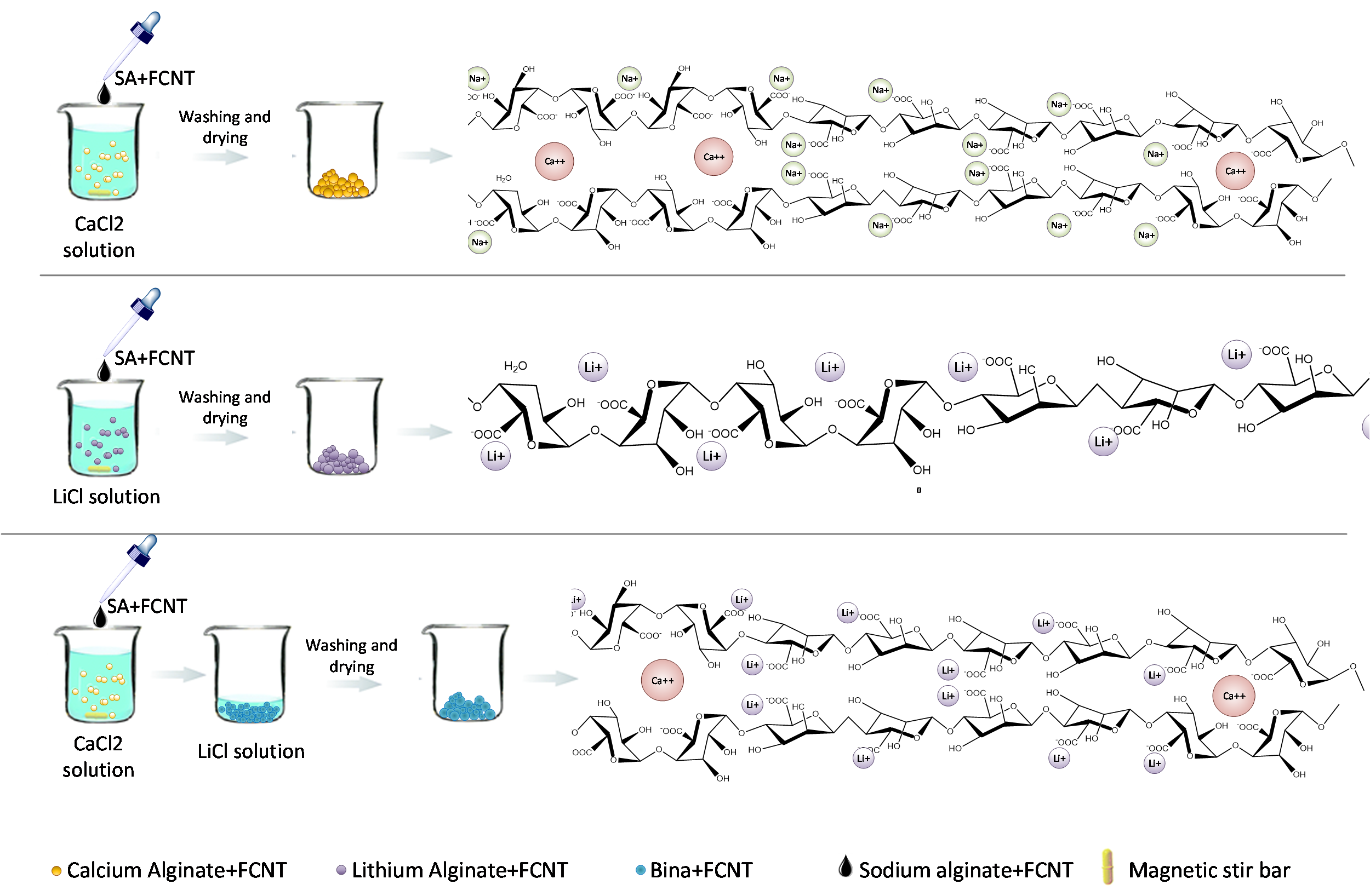 使用更加亲水的锂和钙离子取代钠离子来填充G块和M块,制与FCNT相结合的C/FCNT, L/FCNT和二元Bina/FCNT三种水凝胶