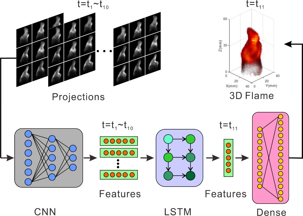 一直以来,火焰三维演化过程的在线精确预测及优化控制是燃烧科研工作者的终极目标,被认为是燃烧界的圣杯。近年来,随着大规模计算机集群和超级计算机的发展,计算流体力学(CFD)取得了长足的进步,已广泛应用于真实环境下各种复杂流场的模拟研究。然而,由于计算量过于巨大,目前最为先进的CFD技术如直接数值模拟(DNS)仍无法实现火焰演化过程的在线精确预测。为此,黄建青等通过结合最先进的实验技术(即单相机高速三维层析技术)和深度学习算法,提出了全新的火焰演化预测方法。概念性验证实验表明,仅仅使用普通GPU服务器即可实现典型的层流扩散火焰和非预混旋流火焰三维演化过程的快速精确预测,处理时间仅需毫秒量级。通过增加GPU的数目或实现并行计算,预测所需时间可进一步缩短,证实了火焰三维演化过程实时预测的可行性。