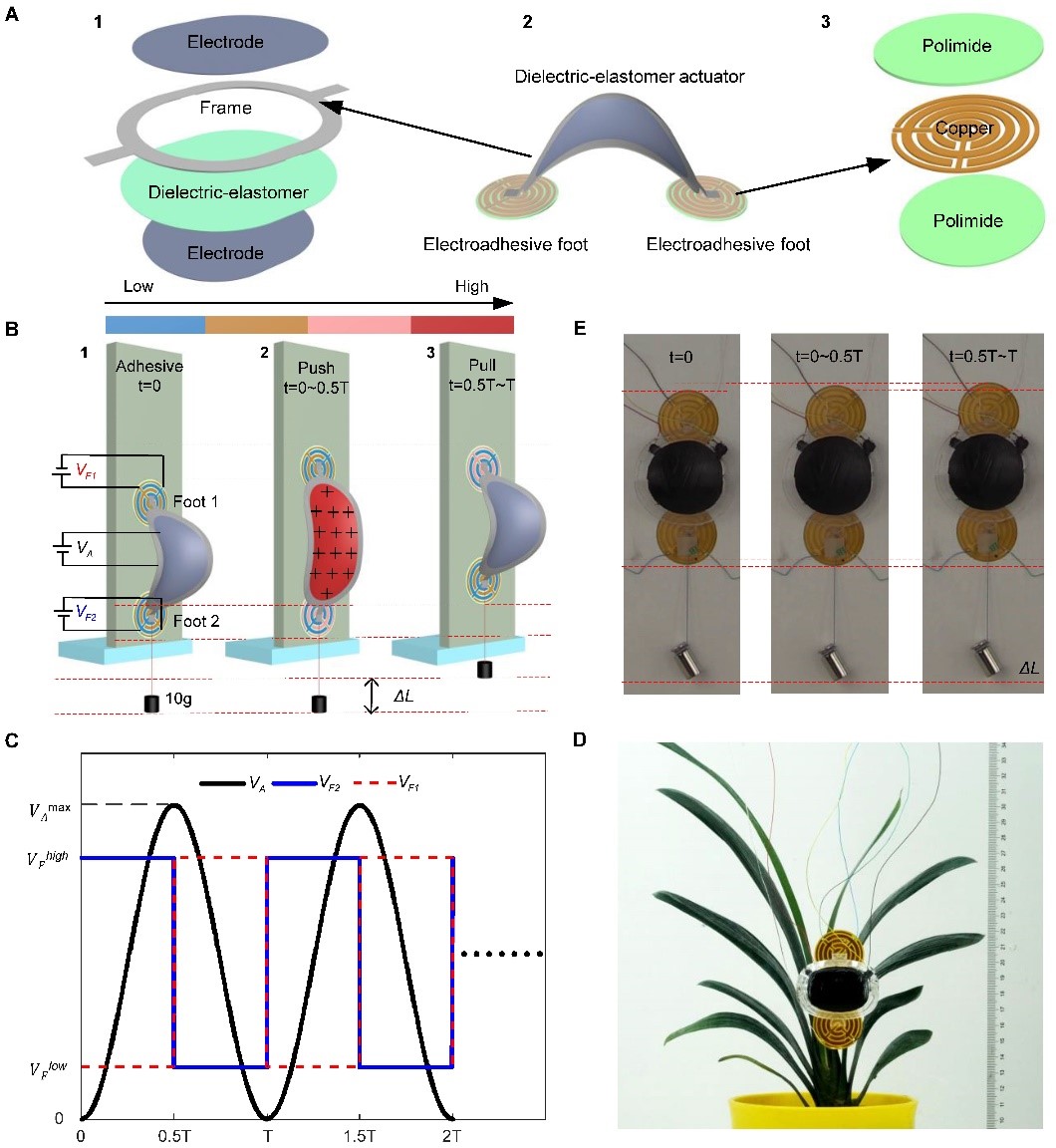 beat365中文官方网站朱向阳、谷国迎团队与麻省理工学院赵选贺团队合作,研制了首个由介电弹性体人工肌肉和静电吸附脚掌构成的软体爬壁机器人(自重2g,身长85mm),其中介电弹性体人工肌肉用于驱动机器人本体的快速周期运动,静电吸附脚掌用于产生时间和空间可控的静电吸附力,机器人的稳定快速爬壁运动由介电弹性体人工肌肉和静电吸附脚掌的协同控制来实现。