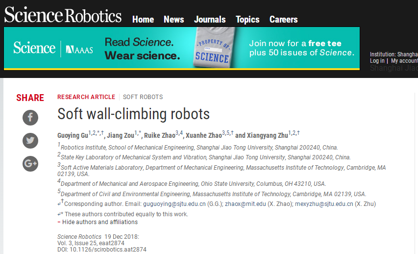 机械动力学院机器人所研究团队在《Science Robotics》发表软体爬壁机器人论文