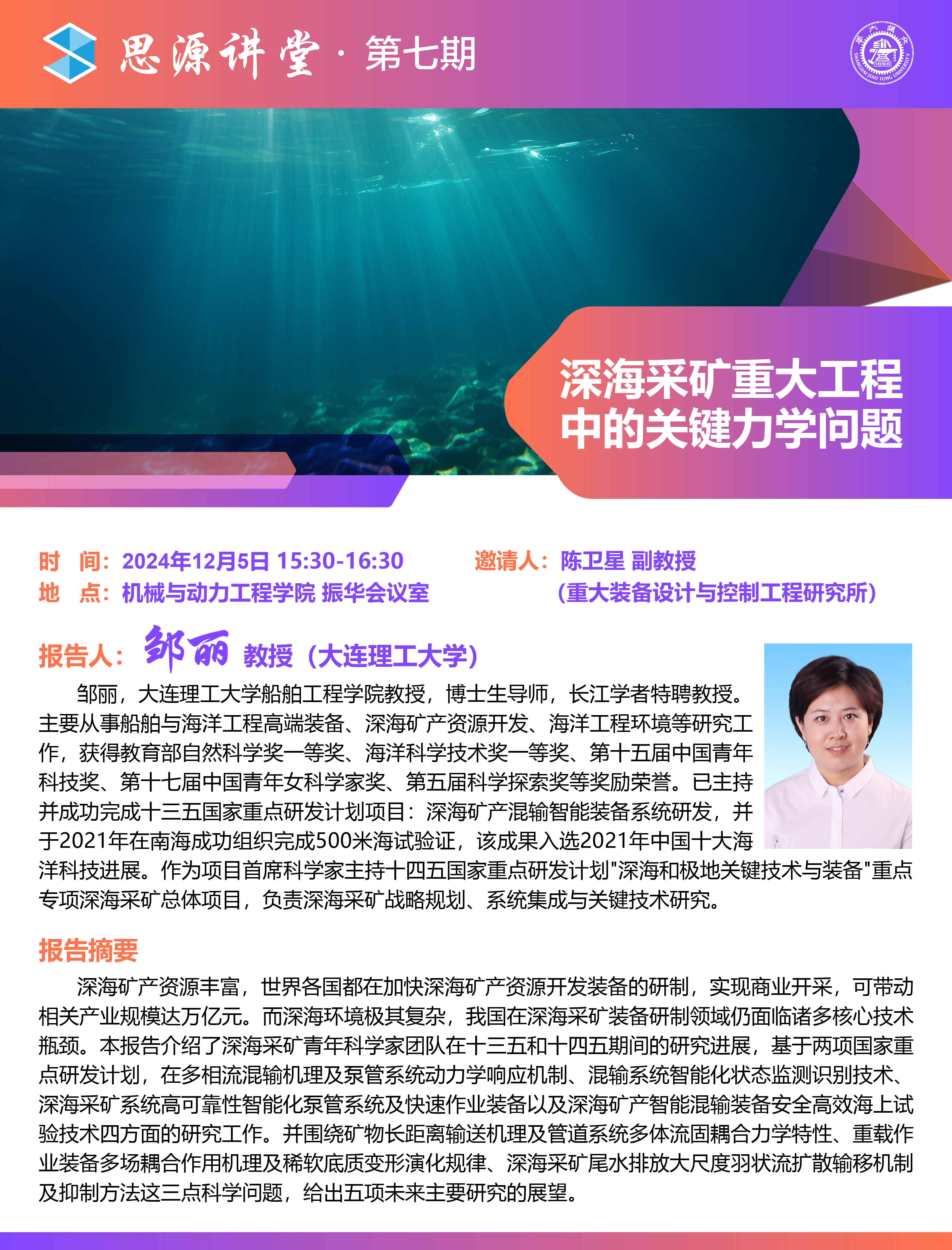 邹丽,大连理工大学船舶工程学院教授,博士生导师。主要从事船舶与海洋工程高端装备、深海矿产资源开发、海洋工程环境等研究工作,获得教育部自然科学奖一等奖、海洋科学技术奖一等奖、第十五届中国青年科技奖、第十七届中国青年女科学家奖、第五届科学探索奖等奖励荣誉。已主持并成功完成十三五国家重点研发计划项目:深海矿产混输智能装备系统研发,并于2021年在南海成功组织完成500米海试验证,该成果入选2021年中国十大海洋科技进展。作为项目首席科学家主持十四五国家重点研发计划"深海和极地关键技术与装备"重点专项深海采矿总体项目,负责深海采矿战略规划、系统集成与关键技术研究。