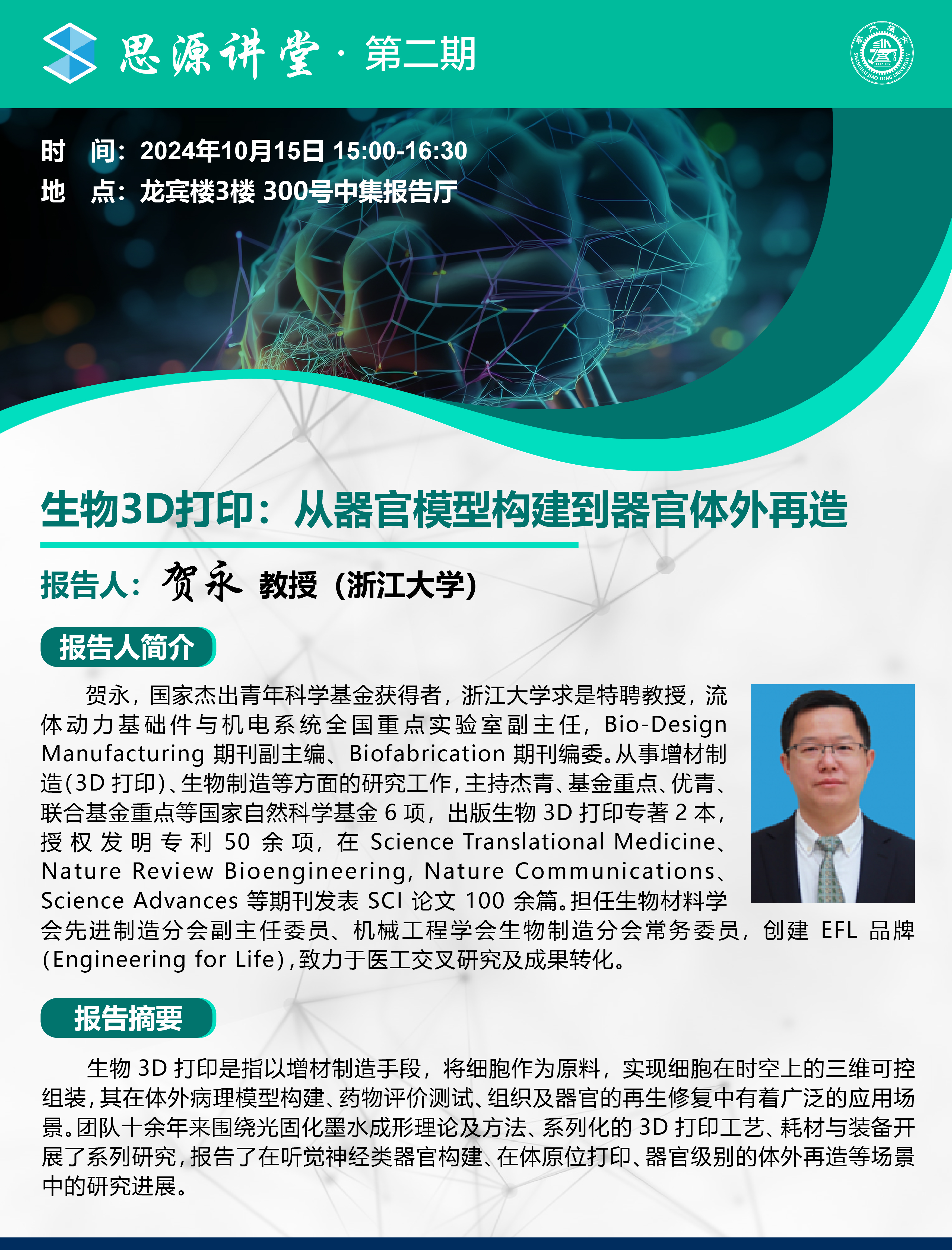 贺永,浙江大学求是特聘教授,流体动力基础件与机电系统全国重点实验室副主任,Bio-Design Manufacturing 期刊副主编、Biofabrication期刊编委。从事增材制造(3D打印)、生物制造等方面的研究工作,主持杰青、基金重点、优青、联合基金重点等国家自然科学基金6项,出版生物3D打印专著2本,授权发明专利50余件,在Science Translational Medicine、Nature Review Bioengineering, Nature Communications、Science Advances等期刊发表SCI论文100余篇,H因子65,论文被引1.2万余次。担任生物材料学会先进制造分会副主任委员、机械工程学会生物制造分会常务委员,创建EFL品牌(Engineering for Life),致力于医工交叉研究及成果转化。
