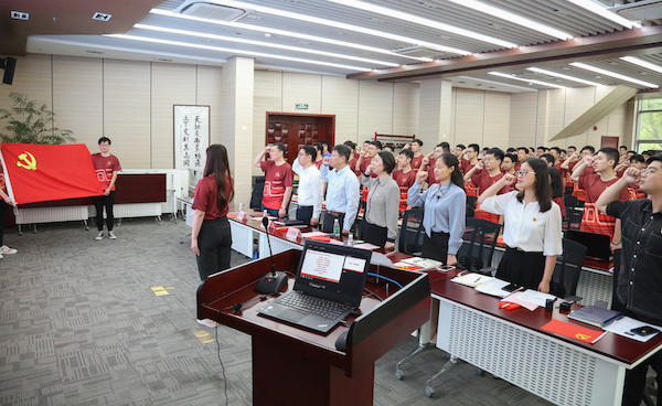 全体毕业生党员在王玉婷的带领下,面对党旗,重温入党誓词。