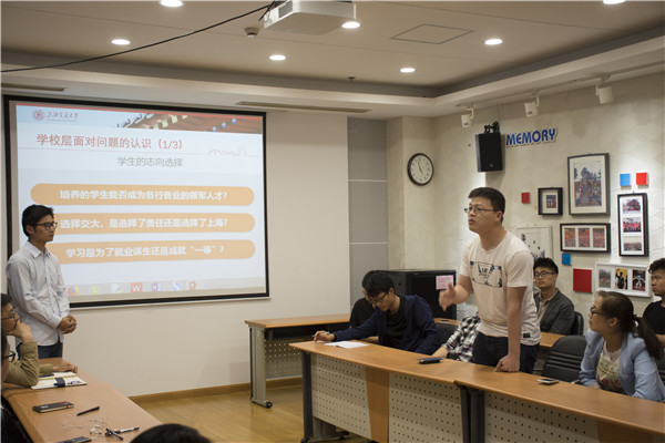 硕士生发展对象焦守华就研究生学术报告规章制度提出意见,建议根据学术报告的内容将观众名额按照一定比例分配给各专业,以及加强研究生人文教育。博士生党员欧阳硕就如何健康地学在交大谈了自己的看法,她号召大家加强体育锻炼。博士生党员陶家琪就“选择交大,是选择了责任还是选择了上海”这个问题表述了自己的看法:选择交大,是选择了责任还是选择了上海,终究还是取决于你想成为一个什么样的人。博士生党员许锐则认为选择交大,是选择了责任还是选择了上海,学习是为了就业谋生还是成就“一等”并不是相互矛盾,不可兼得。我们可以做到既选择了上海又选择了责任。硕士生党员魏佳妮提出了对行政老师要进行考核的建议。硕士生党员吴增辉则作为一名“老土著”谈了交大近些年的变化,他认为学校在一点一点变好,这些问题也都会一一解决。