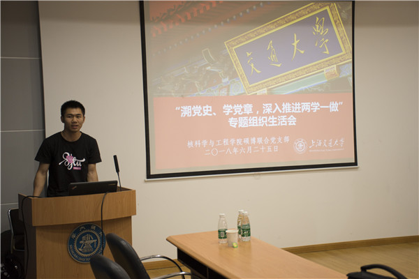 6月25日,核学院硕博联合党支部在机械楼F310开展了以“溯党史、学党章,深入推进两学一做”为主题的专题组织生活会。会议由硕士生党员徐德辉主持。核学院思政老师余天佐出席了本次组织生活会,硕博联合党支部的党员和部分积极分子参与了本次会议的学习和讨论。