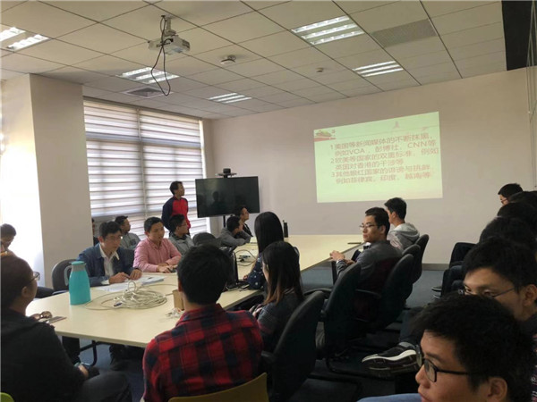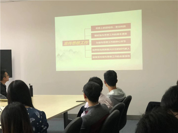 在交流环节,郭风朋与大家进行了分享发言,他结合大量实例,从国际环境和国内现状两个方面分析了新形势下加强党的宣传工作的必要性和紧迫性。分别从“思想上的团结统一更加巩固”、“做好宣传思想工作的根本遵循”、“为宣传思想工作的中心环节”、“培养担当民族复兴大任的时代新人”、“加强党对宣传思想工作的全面领导”几个方面为大家解读习近平总书记的讲话精神。