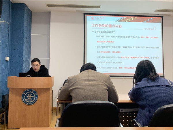 随后,支部宣传委员陈硕带领支部成员共同学习了《中国共产党支部工作条例(试行)》。陈硕结合支部自身情况,分别从背景意义、基本精神、重点内容、学习感悟四个方面对《条例》中党支部职责的定位和要求进行了详细解读,突出彰显了党中央对新时代党支部建设提出的全面规范要求。