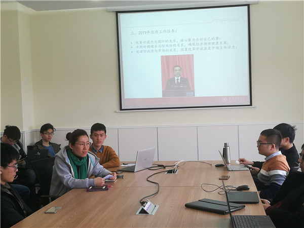 会议伊始,袁锦春带领与会师生党员共同学习了李克强总理在第十三届全国人民代表大会开幕式所做的政府工作报告。报告指出,虽然过去一年我国发展面临国内外复杂严峻形势,经济出现新的下行压力,但是在以习近平同志为核心的党中央坚强领导下,全国各族人民以新时代中国特色社会主义思想为指导,砥砺奋进,攻坚克难,完成全年经济社会发展主要目标任务,决胜全面建成小康社会又取得重大进展。