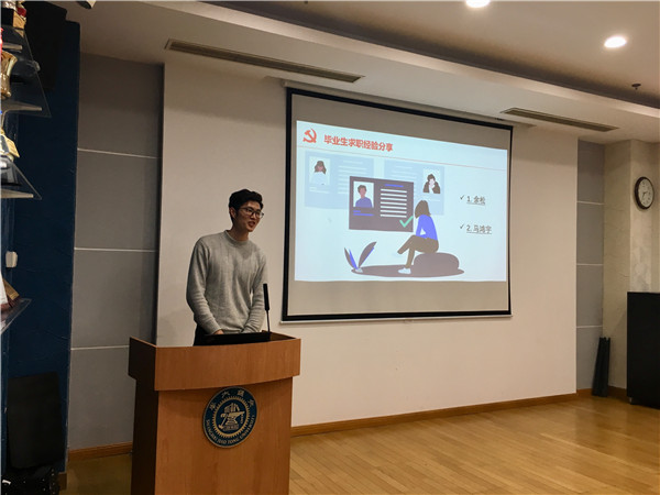 在应届毕业生就业经验分享环节中,支部邀请了毕业生马鸿宇和余松同学进行交流。他们从就业选择、处理科研与求职的协调等方面介绍了自身的经验。他们都认为,自己选择进入国家重点行业就业,既是对自己人生目标的追求,也是想为国家制造行业贡献出自己的一份力量。