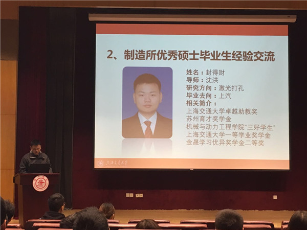 随后,两名优秀的毕业生代表16级博士生傅宇蕾、16级硕士生封得财分别与大家分享了自己学生生涯的经验。傅宇蕾结合自己的亲身经历,建议大家在科研上要做好时间规划,在实习过程中了解行业的实际面貌,从而找到自己合适的方向,做好职业规划。封得财认为,在学习科研的过程中需要早做准备,在面临选择时不要慌乱和迷茫,努力尝试做到不后悔,同时在忙碌学业之余也要注意锻炼、保护身体。
