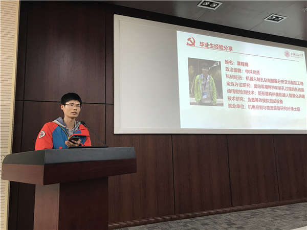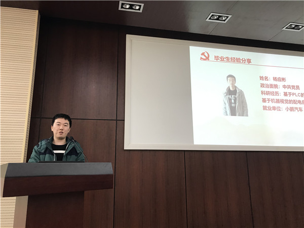 紧接着,毕业生代表覃程锦、刘亚雄和杨应彬分享了求学和求职的宝贵经验。三位毕业生代表深入浅出,从切身经历出发,讲述了自己毕业和择业过程中走过的弯路,并给予学弟学妹们很多有用的建议。覃程锦结合自己博士学习过程,强调科研首先要态度端正,其次要找到自己适合的方向,沉下心去做科研。同时勉励学弟学妹们在科研中要多吃苦、耐寂寞、多交流。