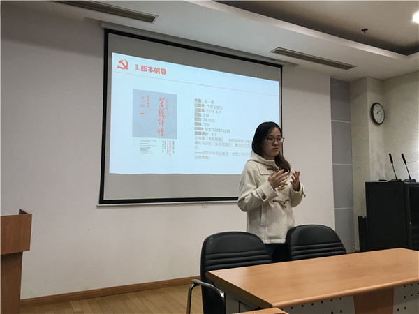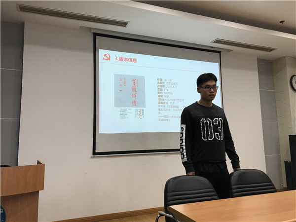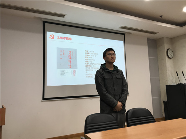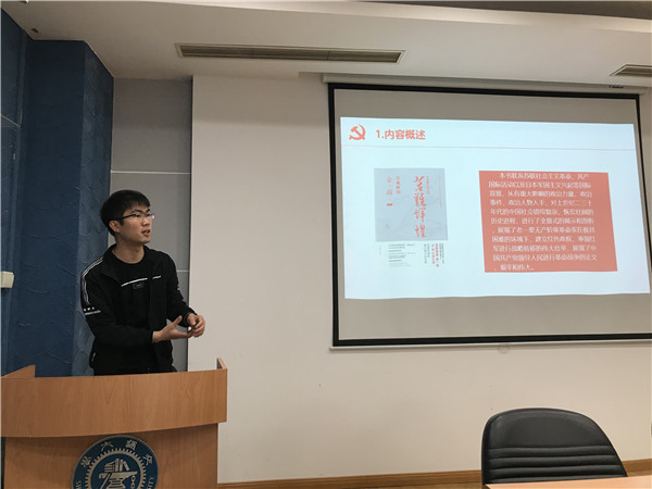 此次党组织生活会以读书生活会的形式开展。丁龙杨首先分享了阅读红色经典书籍《苦难辉煌》的感悟。该著作由中国人民解放军少将金一南完成,展现了老一辈无产阶级革命家在极其困难的环境下,建立红色政权、率领红军进行战略转移的伟大壮举,展现了中国共产党领导人民进行革命战争的正义、艰辛和伟大。丁龙杨最后引用毛主席对人民英雄的颂词鼓励同学们要高举先辈的旗帜,为中华民族的伟大复兴而努力奋斗!
