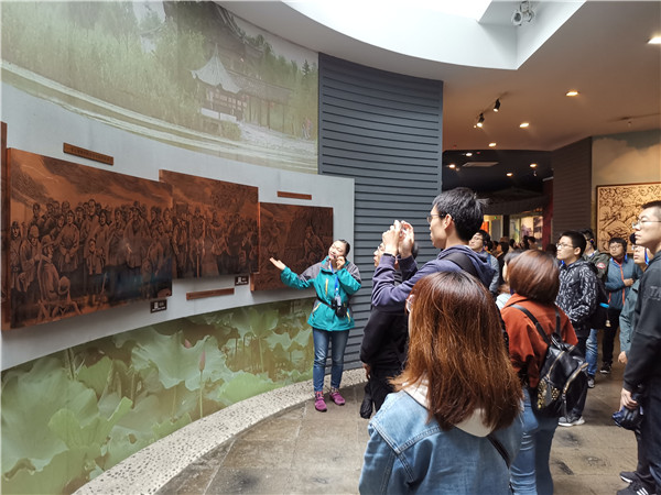 首先,同学们在讲解员的带领下参观了沙家浜革命历史纪念馆。在抗日战争时期,位于阳澄湖畔的沙家浜成为苏、常、太游击根据地。依靠当地人民群众的支持,利用阳澄湖地区天然地理条件,开展艰苦卓绝的抗日武装斗争。血战沙家浜、激战阳沟娄、伏击八字桥、夜袭浒墅关、奇袭虹桥飞机场等历史事件至今仍广为传颂。来自硕士生党支部的马思远同学感慨道:“通过馆内的旧物展示,影像资料重现等方式,我们即使身在今天,也能感受到当年在这片芦苇荡中所发生的惊心动魄的游击抗日战。湖面上一簇簇的芦苇丛,体现了沙家浜抗日军民的鱼水深情。”