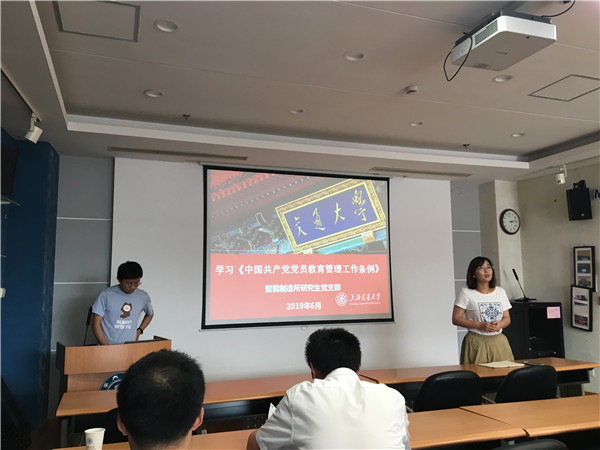 6月21日,机械动力学院智能制造所研究生党支部于机械楼F310召开2019年6月份组织生活会。会议由支部书记尹导主持,系所思政老师陈旦玥及全体支部同志参会,会上进行了学习《中国共产党党员教育管理工作条例》、共行计划暑期社会实践介绍、时政热点讨论与支部支委换届投票选举等环节。