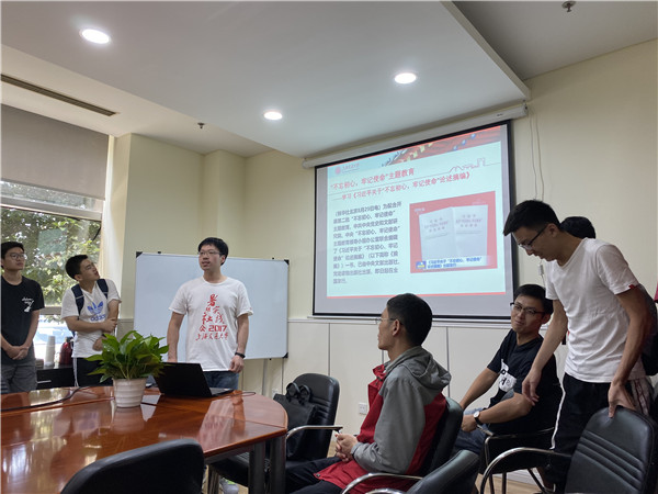 阮海涛讲话后,主持人带领同志们学习了《习近平关于“不忘初心,牢记使命”论述摘编》(以下简称《摘编》)。《摘编》内容摘自习近平总书记2012年11月15日至2019年7月16日期间的讲话、报告、文章、指示、批示等130多篇重要文献,分10个专题,共计362段论述。其中部分论述是第一次公开发表。主持人对《摘编》的每一章进行了解读,之后选取了有代表性的几段内容进行了集体学习与讨论,多位党员同志积极发表了自己的理解与看法。最后号召党员积极学习《摘编》,并将《摘编》的精神贯穿到自己的学习和生活中。