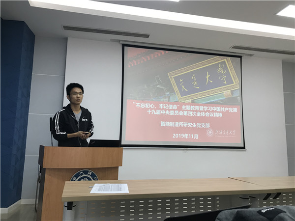 11月9日中午,智能制造所研究生党支部于机械动力学院F楼F310会议室召开主题为“不忘初心、牢记使命”主题教育暨学习中国共产党第十九届中央委员会第四次全体会议精神的组织生活会。本次组织生活会由智能制造所研究生党支部书记王玉坤主持,智能制造所全体研究生党员参加会议。