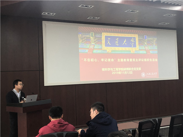 11月12日上午,核科学与工程学院硕、博党支部在机械动力学院振华会议室联合召开“不忘初心、牢记使命”主题教育暨民主评议组织生活会。支部指导老师徐德辉以及全体党员参加了本次会议的学习与讨论。本次会议由博士生党支部书记夏建华主持。