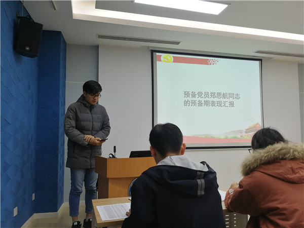 首先开始的党员转正大会在全体奏唱的国歌声中拉开序幕。组织委员张怡洁先依次对储鹏和郑思航两位预备党员的基本信息作以介绍,之后邀请两位同志上台汇报自己的预备期表现情况。随后两位预备党员的预备期考察人分别上台介绍有关情况。最后,冯耀辉代表支委会对储鹏和郑思航两位同志给出中肯评价,他表示,两位同志在预备期内,都能以党员的标准严格要求自己,起到党员模范带头作用。与会党员发表意见后,支部大会经无记名投票表决,一致同意储鹏、郑思航转为正式党员。两位转正对象依次上台进行表态发言。