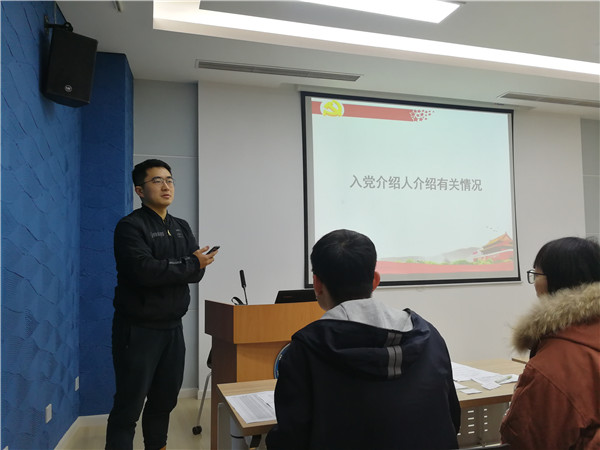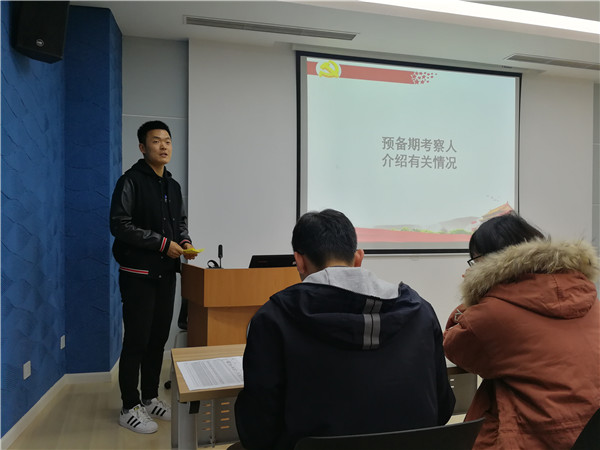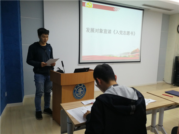 接着进行党员发展大会,组织委员张怡洁分别介绍了邹震峰和杜懿岑两位同学的入党信息、学习工作志愿等基本情况以及支部评价,随后邀请发展对象上台宣读《入党志愿书》。在入党介绍人介绍有关情况后,支委会综合考虑邹震峰和杜懿岑同学日常表现、考察人意见、群众座谈会意见和导师意见,认为两位同学在党性修养、科研工作以及日常生活中都表现良好,基本符合党员条件。与会党员也表达了自己的意见,纷纷表示赞同支委会的考察意见。经无记名投票表决和支部大会讨论,一致同意接受邹震峰、杜懿岑为预备党员。两位发展对象依次上台进行表态发言。