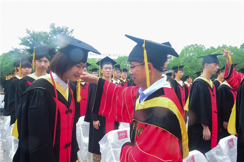在庄严神圣的学位授予仪式环节中,导师依次走到学生当中,为毕业生拨穗正冠、握手表示祝贺。