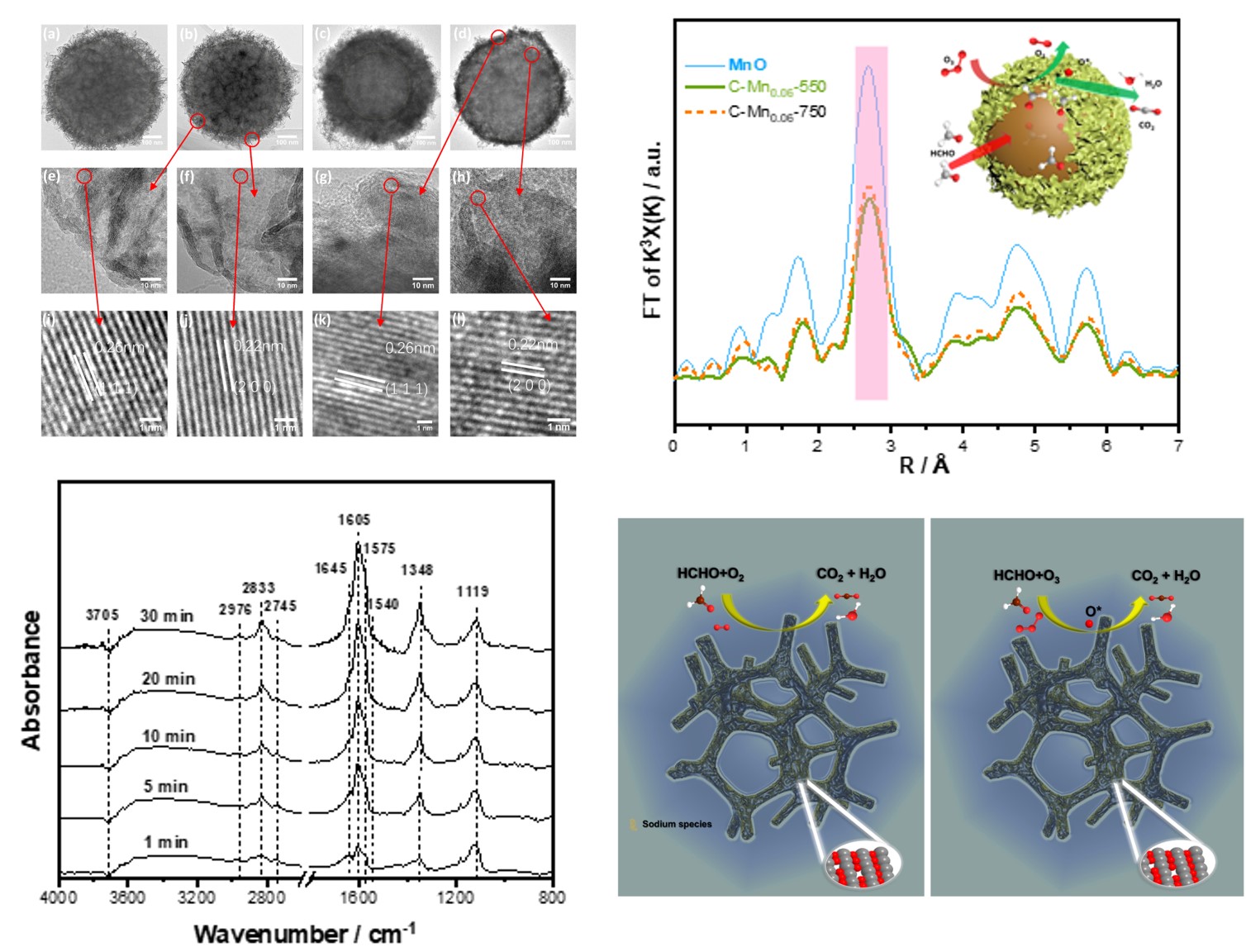 室内空气质量已成为影响人们身体健康和安全的主要因素,如何实现对室内低浓度多种类污染物安全、高效、常温催化净化是当前研究的主攻方向。论文基于多种原位表征手段,从微观、介观等多种尺度层次开展研究,阐明了臭氧共存及无臭氧情况下的甲醛降解路径,揭示了催化氧化反应中,氧化锰/碳复合材料以及有序介孔氧化镍反应活化中心,实现常温氧化降解的机理。该研究进一步通过巧妙的结构设计,构建了表面具有高度不饱和配位的MnO@C核壳纳米催化剂以及三维有序介孔镍氧化物催化剂,可实现对气态污染物稳定的吸附浓缩、臭氧和挥发性有机物催化氧化功能,在常温下实现了甲醛和臭氧的完全同时去除,并且二氧化碳转化率接近100%。该研究对设计高稳定性的VOCs-O3同时去除催化剂有着重要意义,同时发展了利用原位表征技术研究该催化过程和机理的新手段。