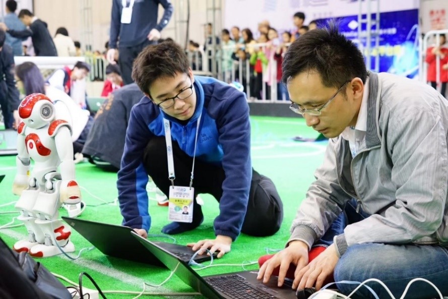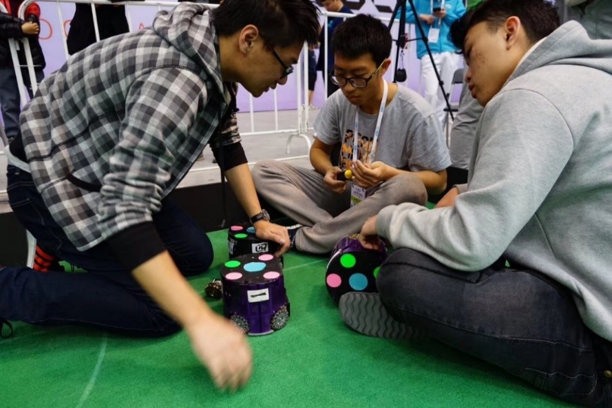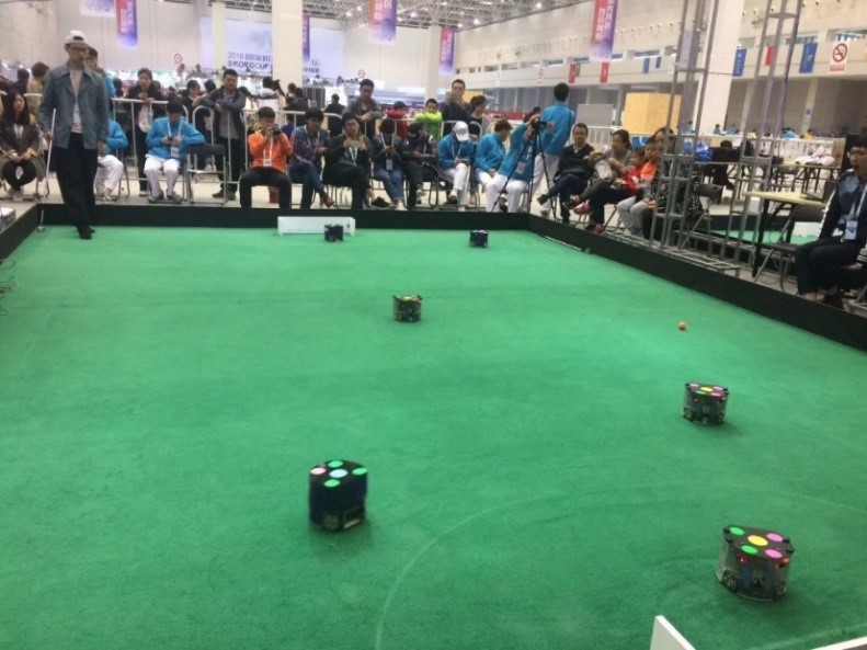 小型组轮式机器人足球比赛是RoboCup机器人世界杯赛的主要项目之一,涉及机器人学、人工智能、智能控制、机器视觉和数字图像处理等多个领域,是机器人技术和人工智能理论良好的实验平台。比赛中,双方队伍各使用3台足球机器人踢足球。整个系统包括机器人车载子系统、视觉子系统和决策子系统。学生主要通过编程,让每个机器人具有守门员、前锋、后卫等不同功能,不同角色相互协作,完成射门得分。在此过程中,学生可以开展机器人运动控制、计算机视觉定位、人工智能、决策、路径规划与避障算法等实验研究。“SRC战队”从22支队伍中突围而出,以2:0的成绩取得了决赛胜利,获得了本次比赛冠军。
