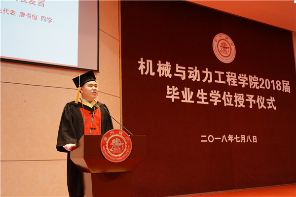14级钱学森班和首届致远工科荣誉计划学子廖书恒代表全体毕业生发言。他曾经在暑期到工厂去考察,那时他见到了工厂的落后,也意识到了中国制造业的需要。于是他决定用自己的努力去为中国的制造业添砖加瓦,为中国制造2025战略规划实现奉献自己的力量。结合自己的经历,他鼓励毕业生们要心怀责任与担当,谨记“饮水思源,爱国荣校”之校训,志存高远,砥砺奋进,不负交大机动人这一称号。