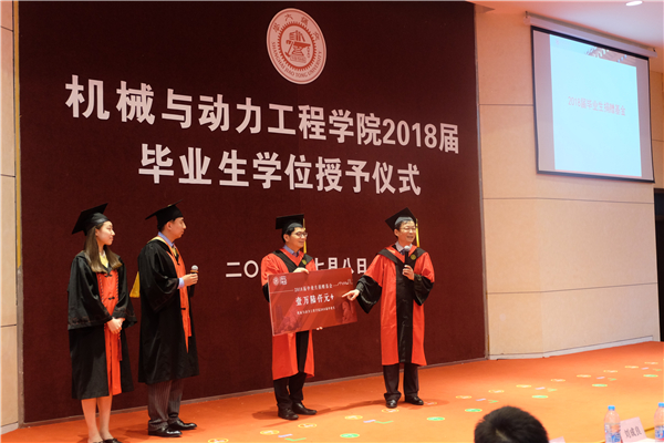 典礼接近尾声,全体毕业生为学院赠送了礼物——毕业生捐赠基金。2018届毕业生秉承“爱国荣校,饮水思源”的校训,微薄之情聚沙成塔,聚水成涓,感恩学院培养,助力母院发展,成立了此基金,用于建设学院的教育、研究以及服务师生方面的活动,促进在校师生的发展。这是同学们对母院的拳拳感恩之情,杜朝辉和彭志科代表学院接受了礼物,同时向同学们回赠了学院精心准备的礼物,希望毕业生们能铭刻在交大的美好记忆,铭记母校,多回来看看。