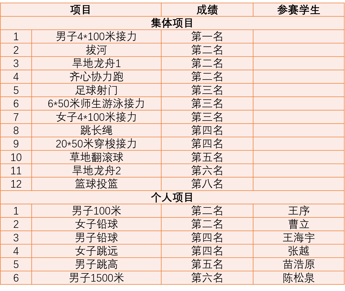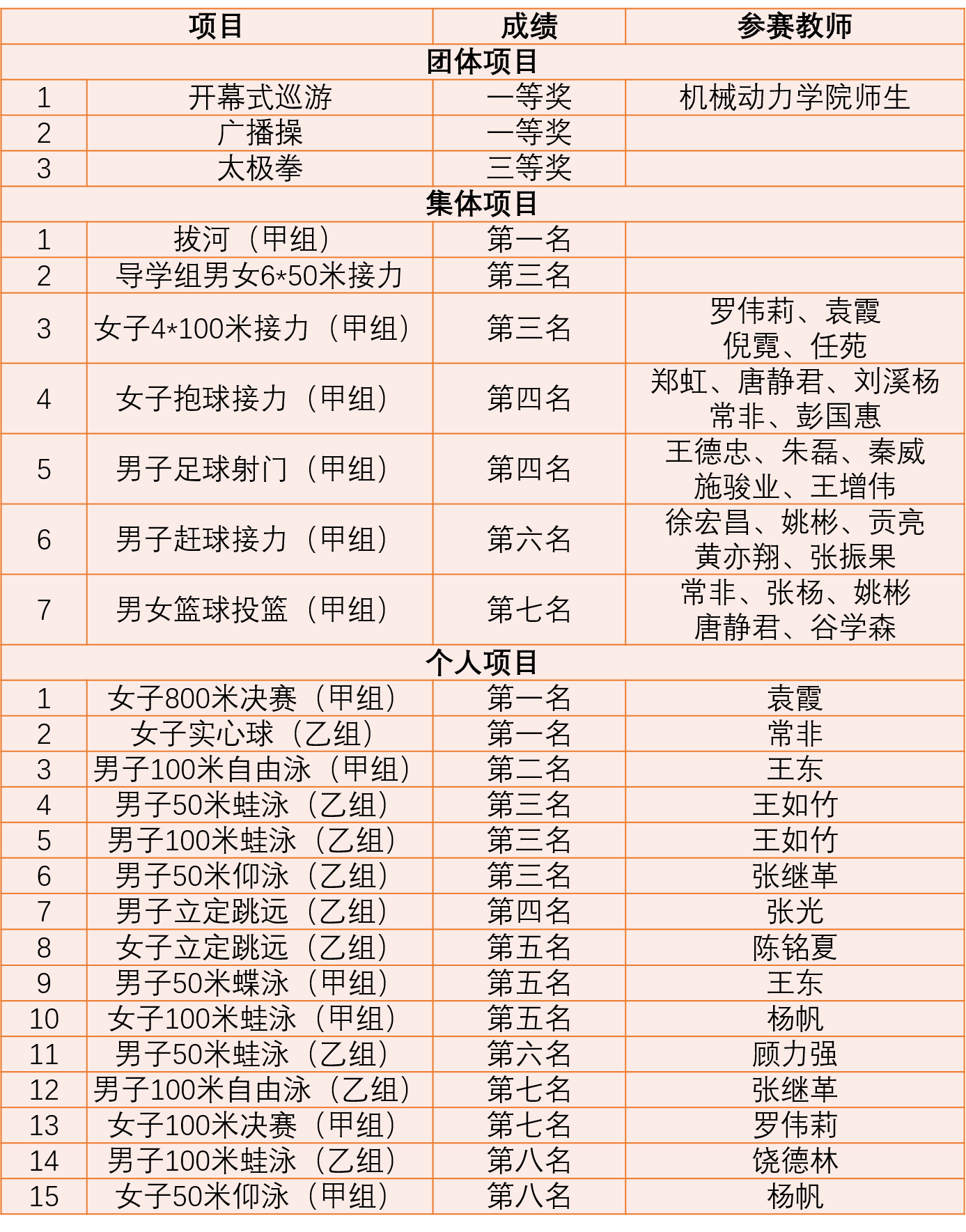 集体项目和个人项目中,学院教职工在拔河比赛、女子800米、女子实心球投远中奋力拼搏,勇夺冠军,学院学生在男子4*100米接力中获得第一名。此外,beat365官网师生在立定跳远、足球射门、男子50米蝶泳、女子100米等比赛中也获得了较好成绩。