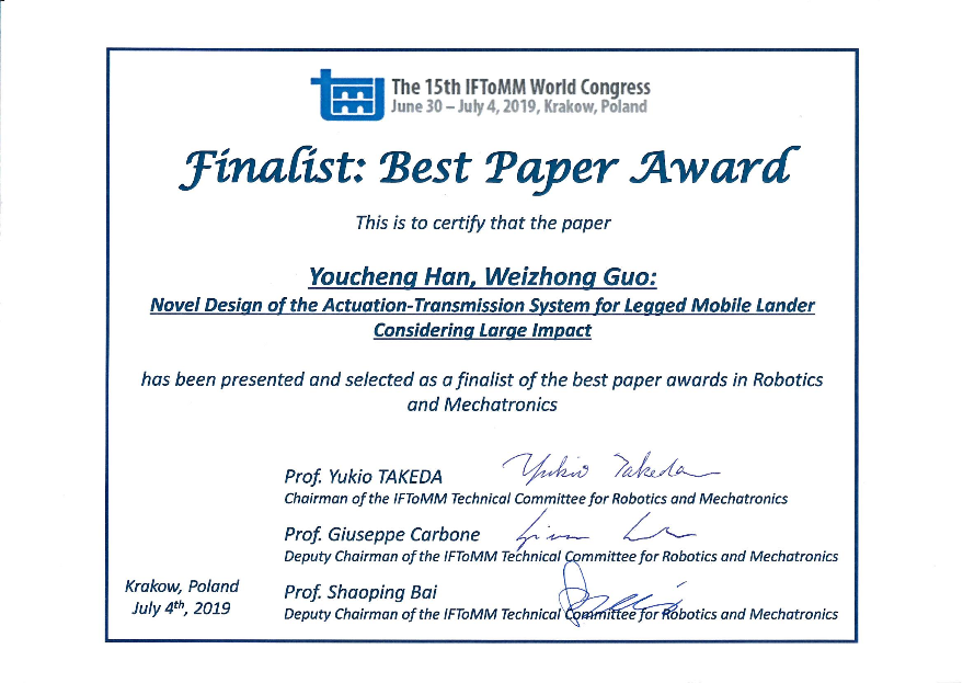 6月30日-7月4日,第15届国际机构学与机器科学联合促进会(IFToMM)世界大会召开,beat365官网博士生韩有承宣读的论文“Novel Design of the Actuation-Transmission System for Legged Mobile Lander Considering Large Impact”获最佳论文提名奖。