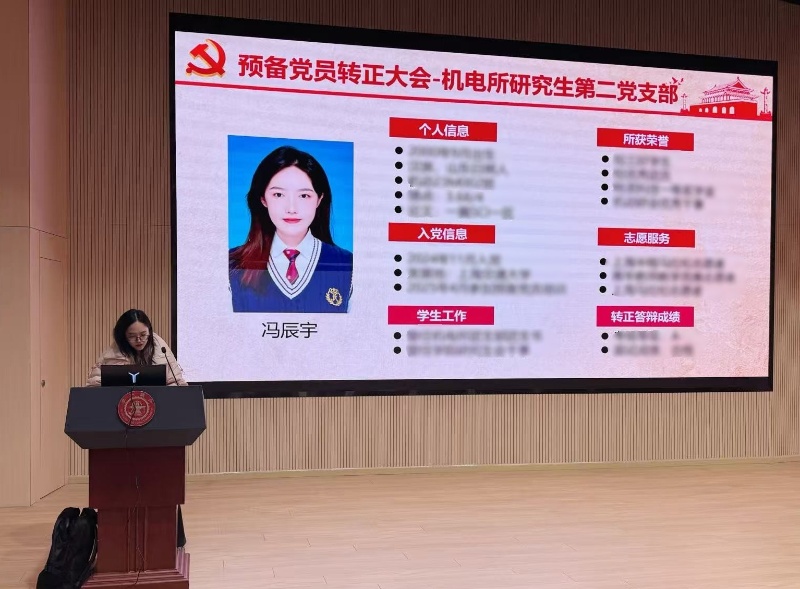 随后,大会审议了预备党员转正事宜。冯辰宇汇报了预备期内在科研创新、学生工作、志愿服务等方面的综合表现。经到会党员充分讨论和表决,一致同意冯辰宇按期转为中共正式党员。接着,新生党员依次进行自我介绍,分享自身学习科研情况和入党初心,进一步增进了支部成员之间的了解与联系。