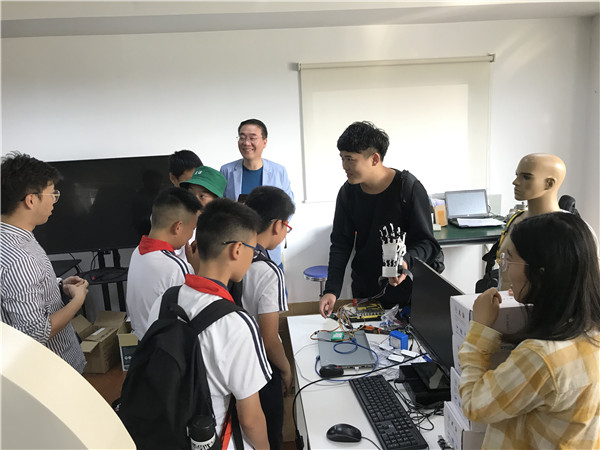 在生物机器人实验室,开放参观的有手功能康复外骨骼系统、功能性电刺激系统、基于超声信号的手势识别系统等项目。党支部刘胜杰、吉斌用浅显易懂的语言介绍项目的基本原理、应用场景,并进行了实物演示,七宝实验中学的孩子们还体验了功能性电刺激系统,感受到现代科技设备的进步,孩子们惊叹原来“钢铁侠在未来也不再是虚幻”。