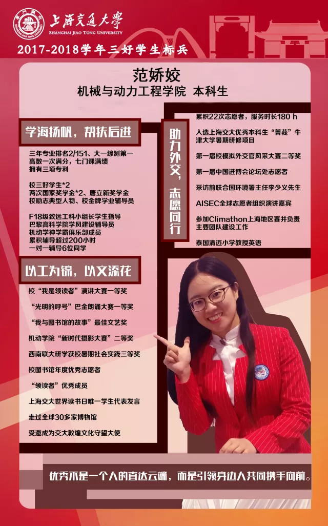 范娇姣的求学之路并不是那么简单。在人才济济的交大,她的成绩起先并不占优,甚至在第一学期的期末还是班里的倒数。不甘于此的她,晨起诵读夜用功、在图书馆中奋斗朝夕、自习室里的奋笔疾书成为了她的日常,寝室楼中与同学的深夜讨论成为了她的习惯。三载光阴荏苒,她在求学道路上不断进步,荣获国家奖学金、唐立新奖学金,被评为“2018年度校励志典型人物”,成功实现逆袭。