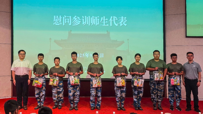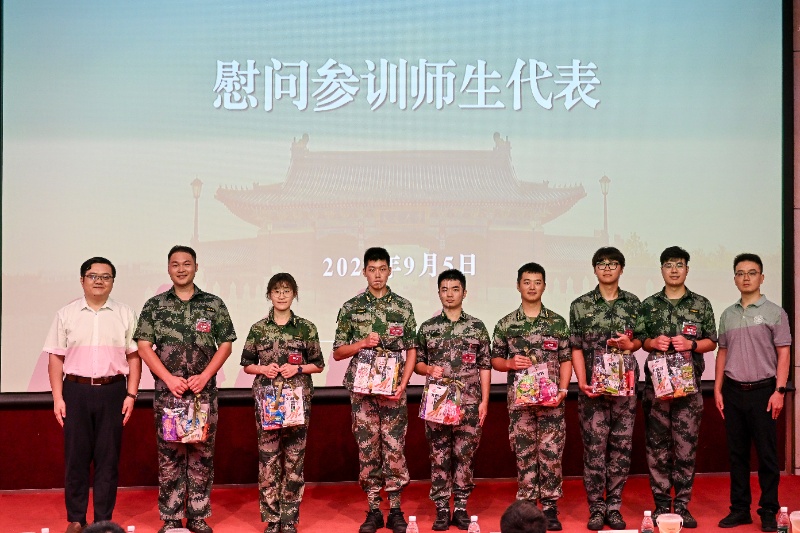 夏唐斌和王国锋为参训学生代表与教官、教师代表送上慰问礼包,感谢他们在军训中的付出与坚守。