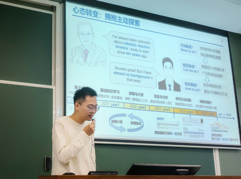 在经验分享环节,优秀学长熊再立、黄哲作主题分享。熊再立结合自身科研经历,建议同学们从“是否值得——能否完成——如何完成”三个维度做好课题规划,并介绍了常用科研软件与时间管理方法。黄哲则围绕具体科研课题实践,分别从“如何做科研”“如何写论文”“如何做汇报”交流了攻关体会与实操要点。