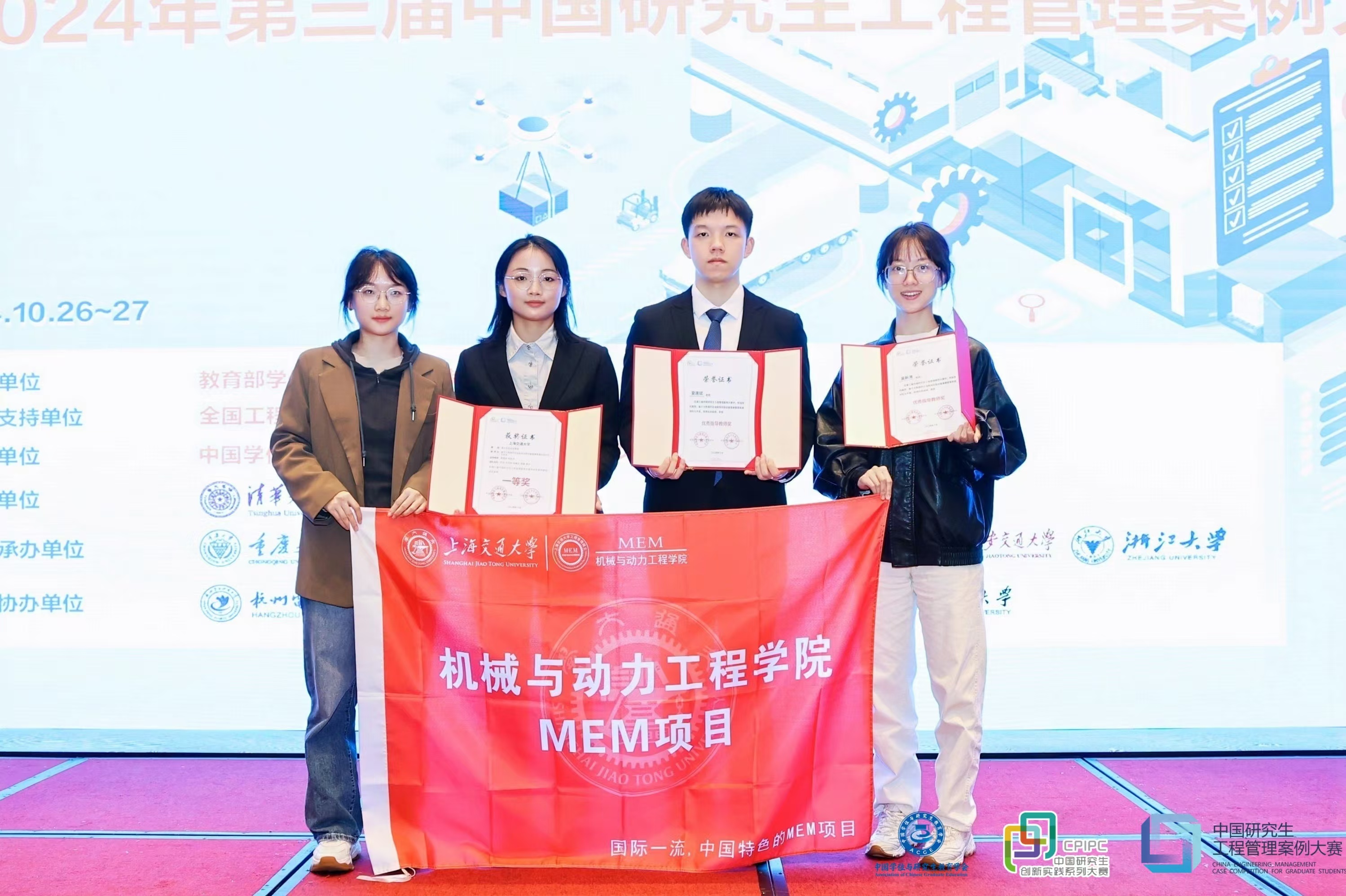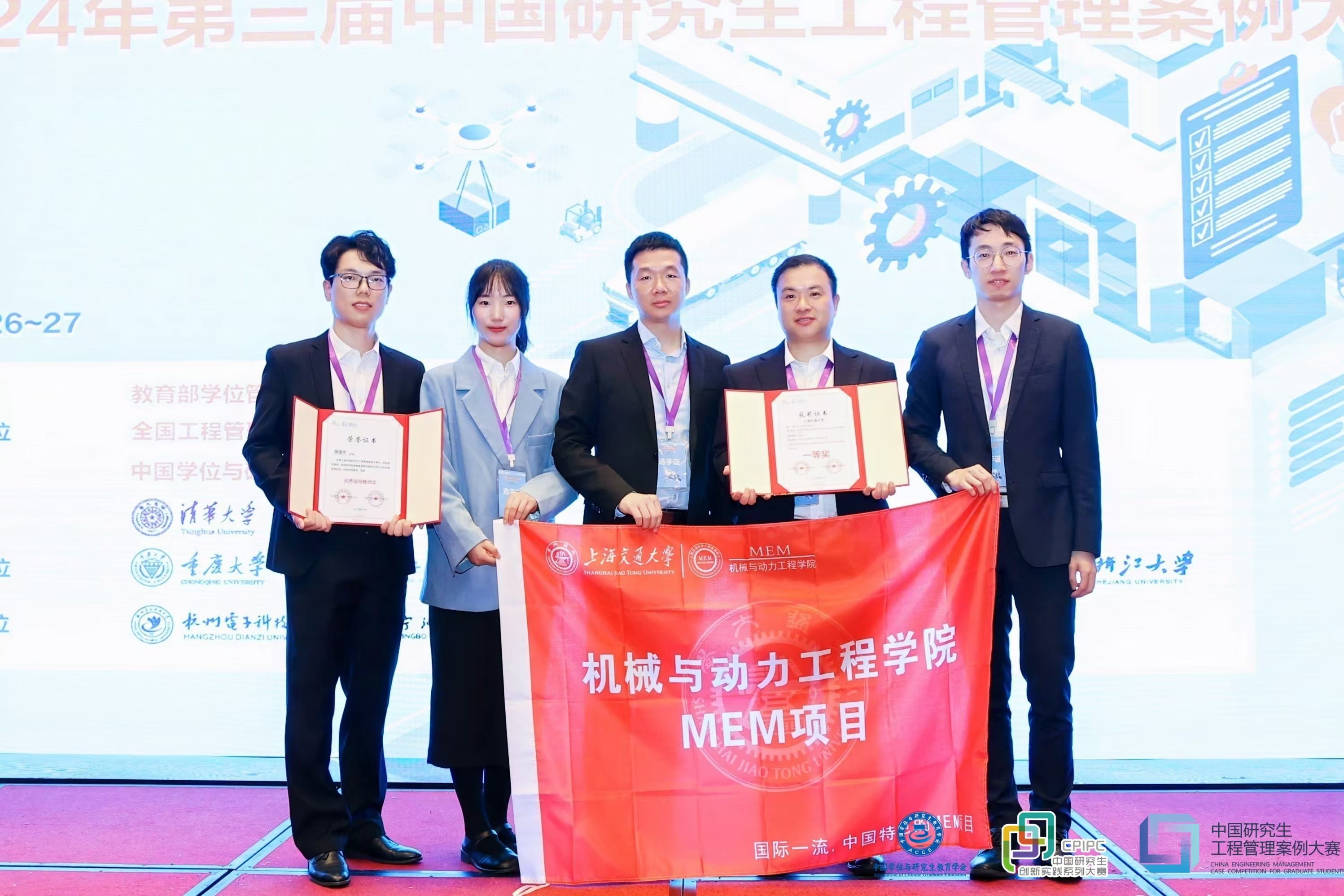 由夏唐斌和嘉洋科技总工程师吴新涛联合指导,在读工业工程研究生罗风、吴泽林、崔曦文、程鑫,嘉洋科技企业专家蔡宇组成的校企联合团队获重大系统研发赛道一等奖(全国第一名)。由蒋祖华指导,2023级工程管理研究生徐靖、汪洋、蒋嘉宝、沈夏雨、唐一蕾组成的团队获重大系统研发赛道一等奖(全国第二名)。同时,夏唐斌、蒋祖华、吴新涛获“优秀指导教师奖”。